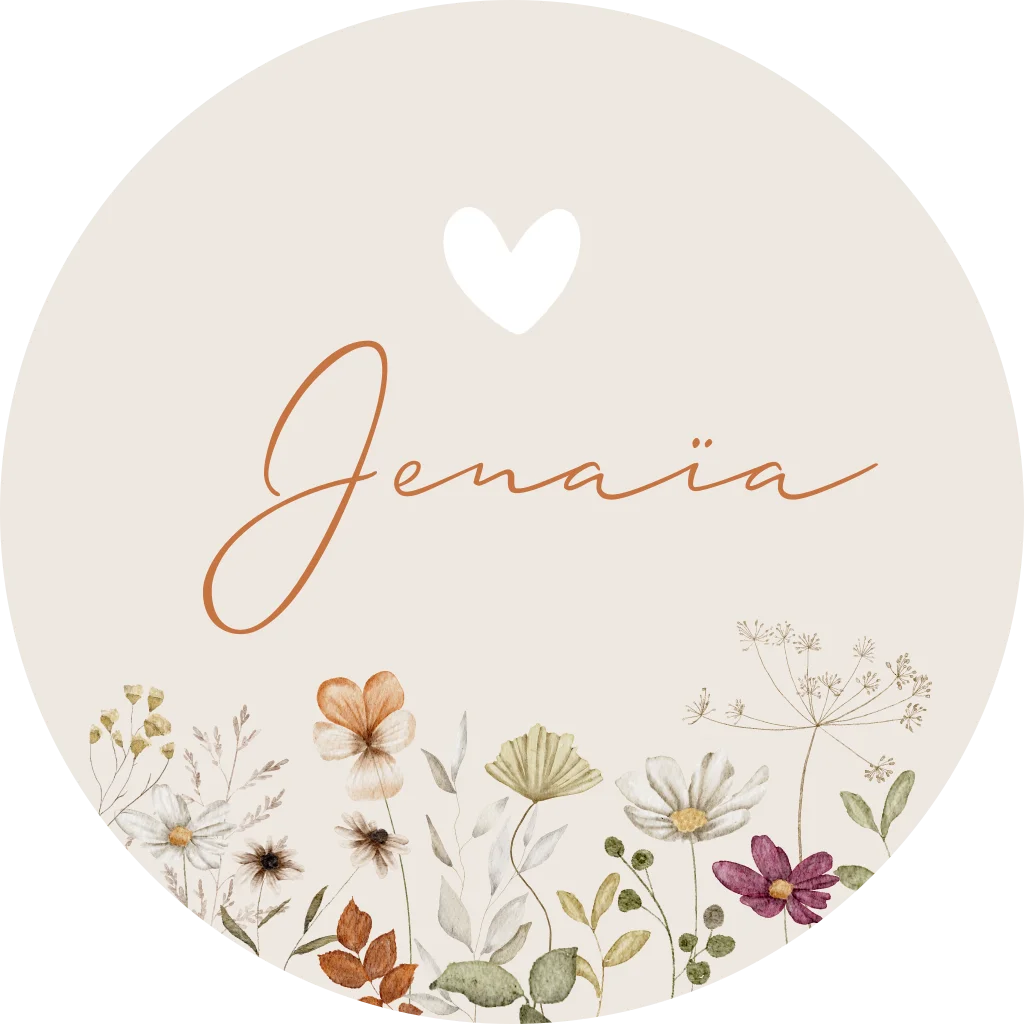 Een lief en romantisch stickertje om de enveloppen mee af te sluiten of te gebruiken voor doopsuikers, met allerlei waterverf bloemetjes in diverse kleuren. Op sticker Jenaïa staat de naam in een chique bruine kleur. Wil je graag iets aanpassen? Neem dan een kijkje in onze editor voor de vele opties!
