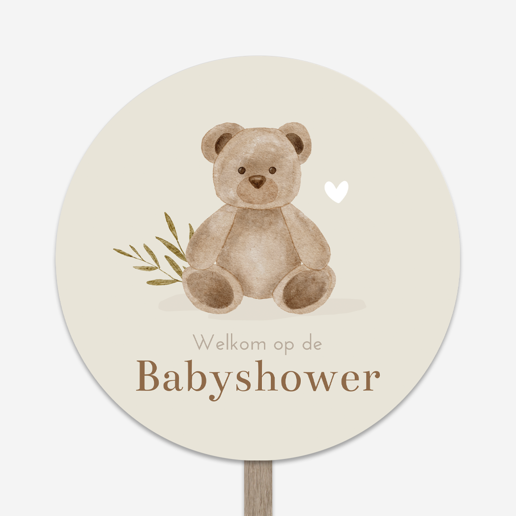 Rond beige kleurig welkomstbord voor de babyshower met een grote teddybeer er op in waterverf stijl. Je past geboortebord teddy ontwerp eenvoudig aan in onze online editor.