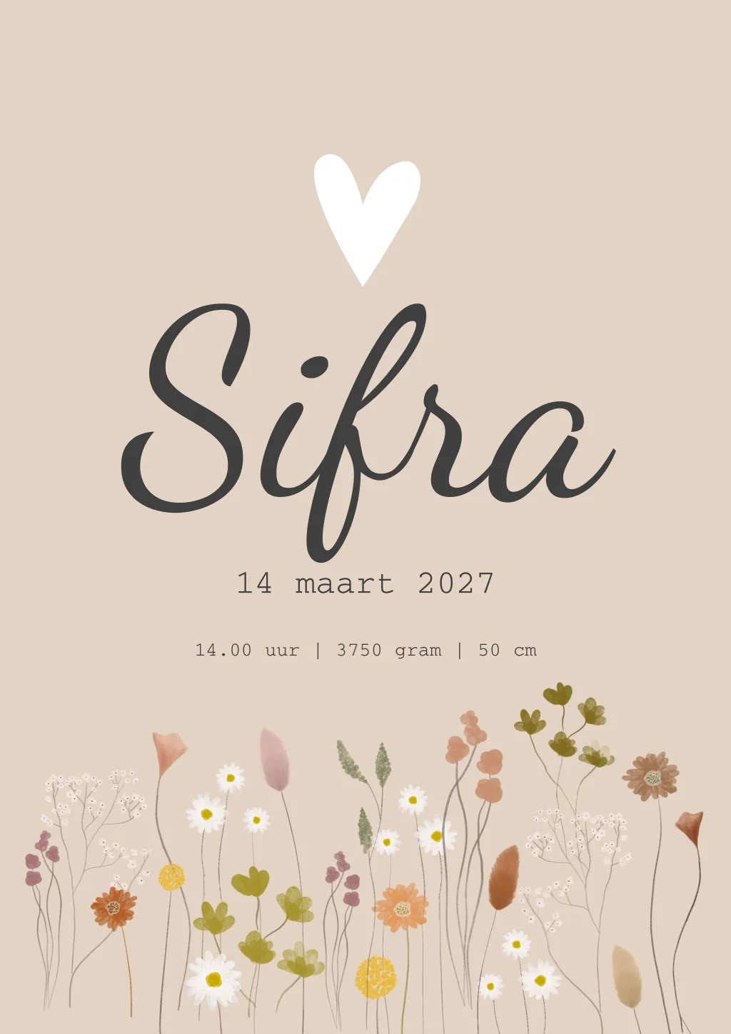 Een hip beige poster met allerlei soorten bloemen in diverse kleuren. Poster Sifra is geheel naar wens aan te passen.