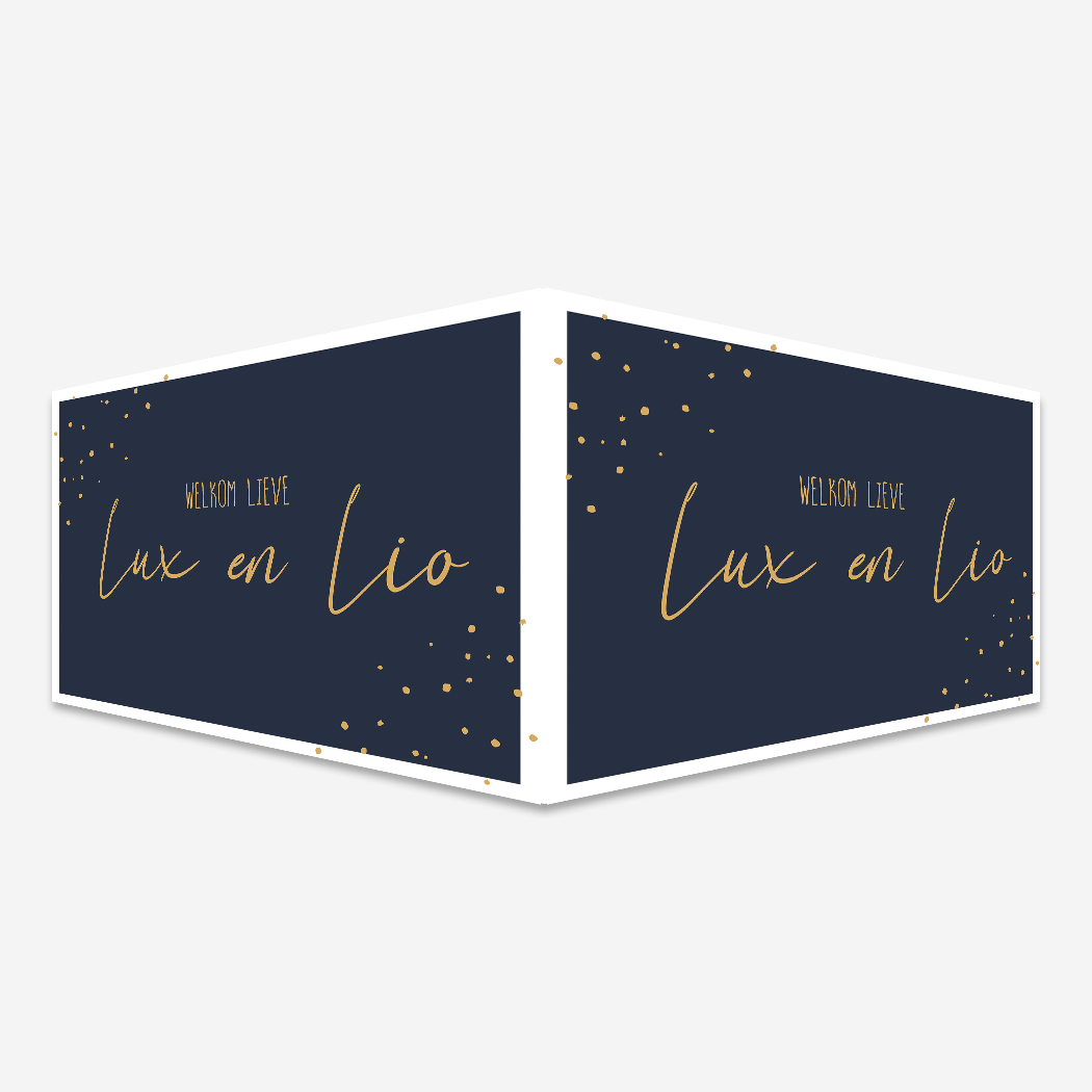 Een stoer donkerblauwe geboortebord voor op het raam met een witte omranding en stippen in goudkleur. De namen hebben een speels lettertype die je volledig naar eigen smaak kunt aanpassen. Door het witte kader wordt raambord Lux en Lio een klassiek en chique ontwerp.