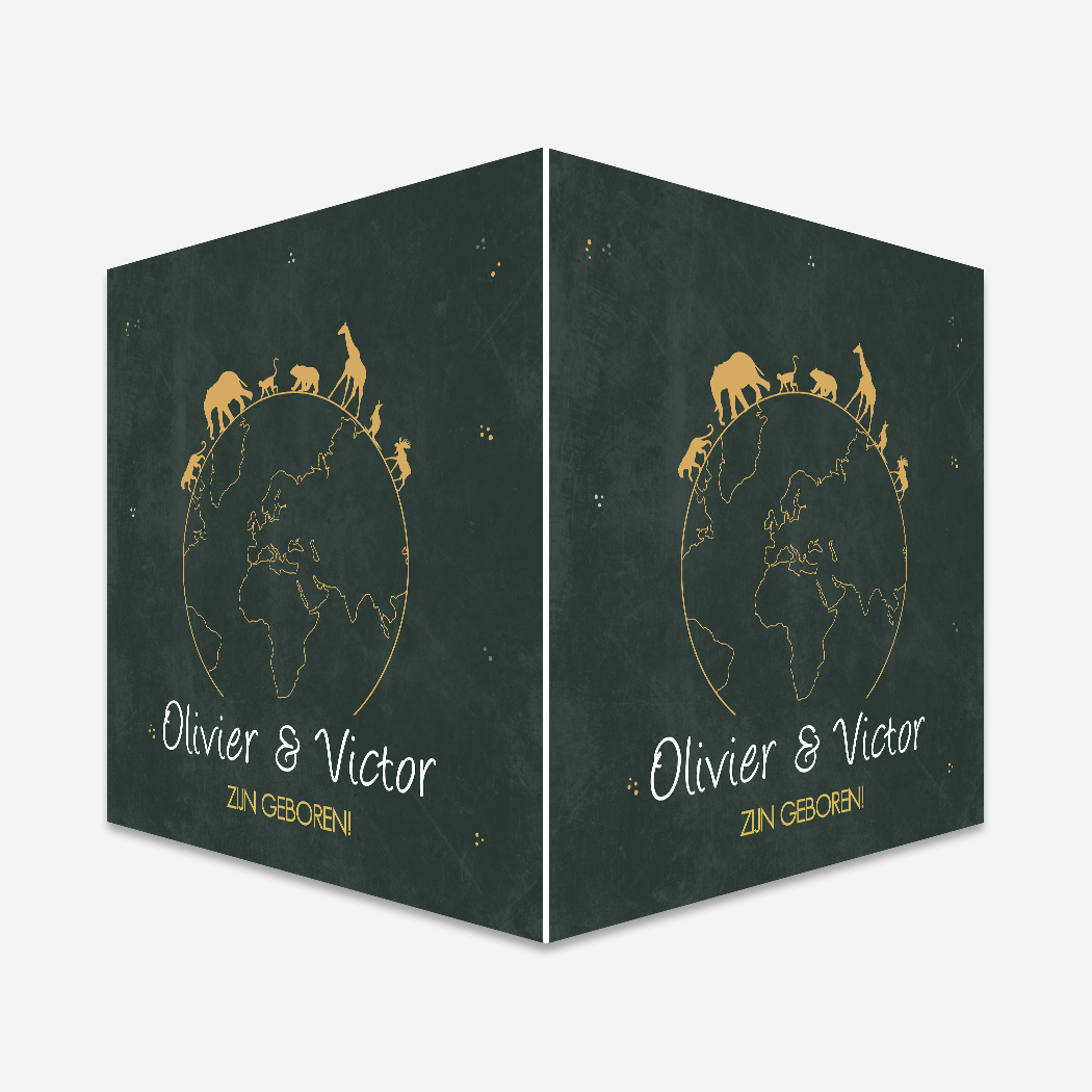 Stoer donkergroen bord voor op het raam voor een tweeling, met wereldbol en dieren. Raambord Olivier en Victor bevat een giraffe, edelhert, kangoeroe, ijsbeer, aapje, olifant en jaguar. Je kan naar eigen wens dieren vervangen in de editor. Tip: leuk om te geven als kraamcadeau!