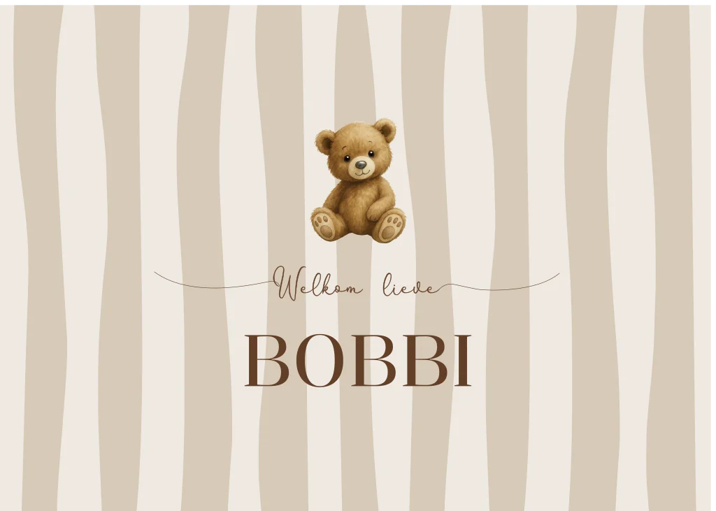 Een gestreept geboortebord voor op het raam met beertje. Raambord Bobbi is naar eigen wens aan te passen in onze editor.