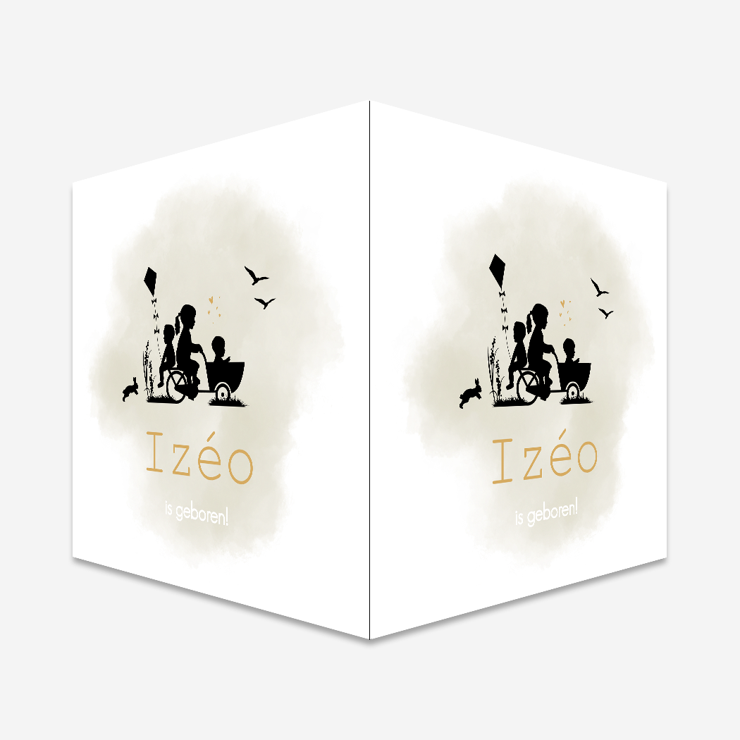 Vierkant geboortebord voor op het raam met een illustratie van broertjes en zusjes die samen op een bakfiets fietsen. Het kindje achterop houdt een vlieger vast en een konijntje hupst in het gras de kindjes achterna.