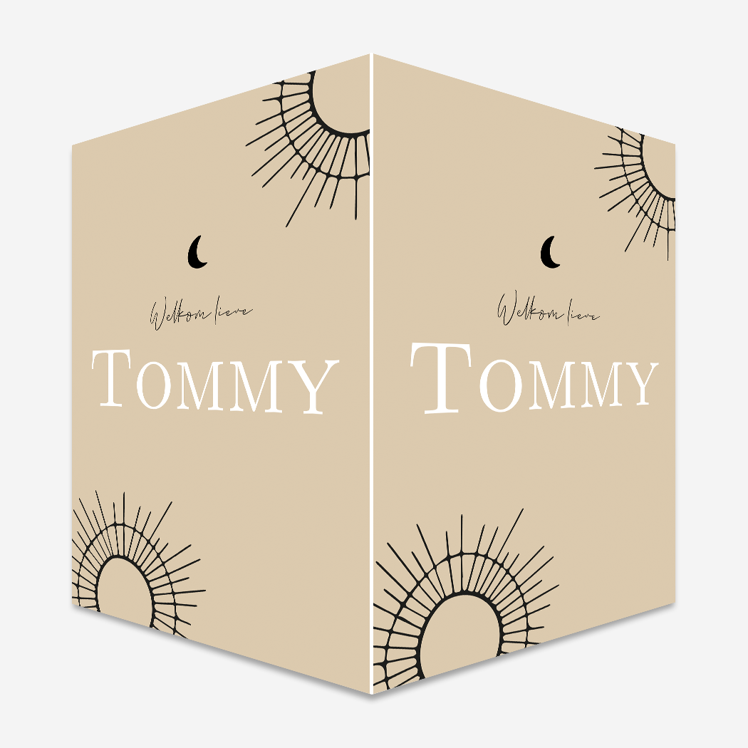 Een trendy geboorteraambord om de geboorte van je kindje te vertellen aan de buurt. Dit geboortebord is in beige/camel kleur met zwarte lijntekening van zonnetjes. Raambord Tommy kun je eenvoudig aanpassen van kleur en/of opmaak.