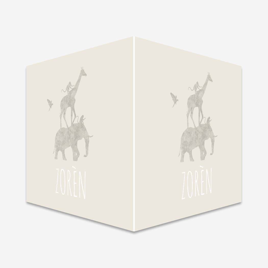 Een simpel en neutraal beige/crème raambord met dieren op elkaar gestapeld. Op raambord Zorèn zie je een olifant, giraffe en een aapje, naast de dieren vliegt een papegaai. Wil je graag iets aanpassen? Neem dan een kijkje in onze editor voor alle opties.