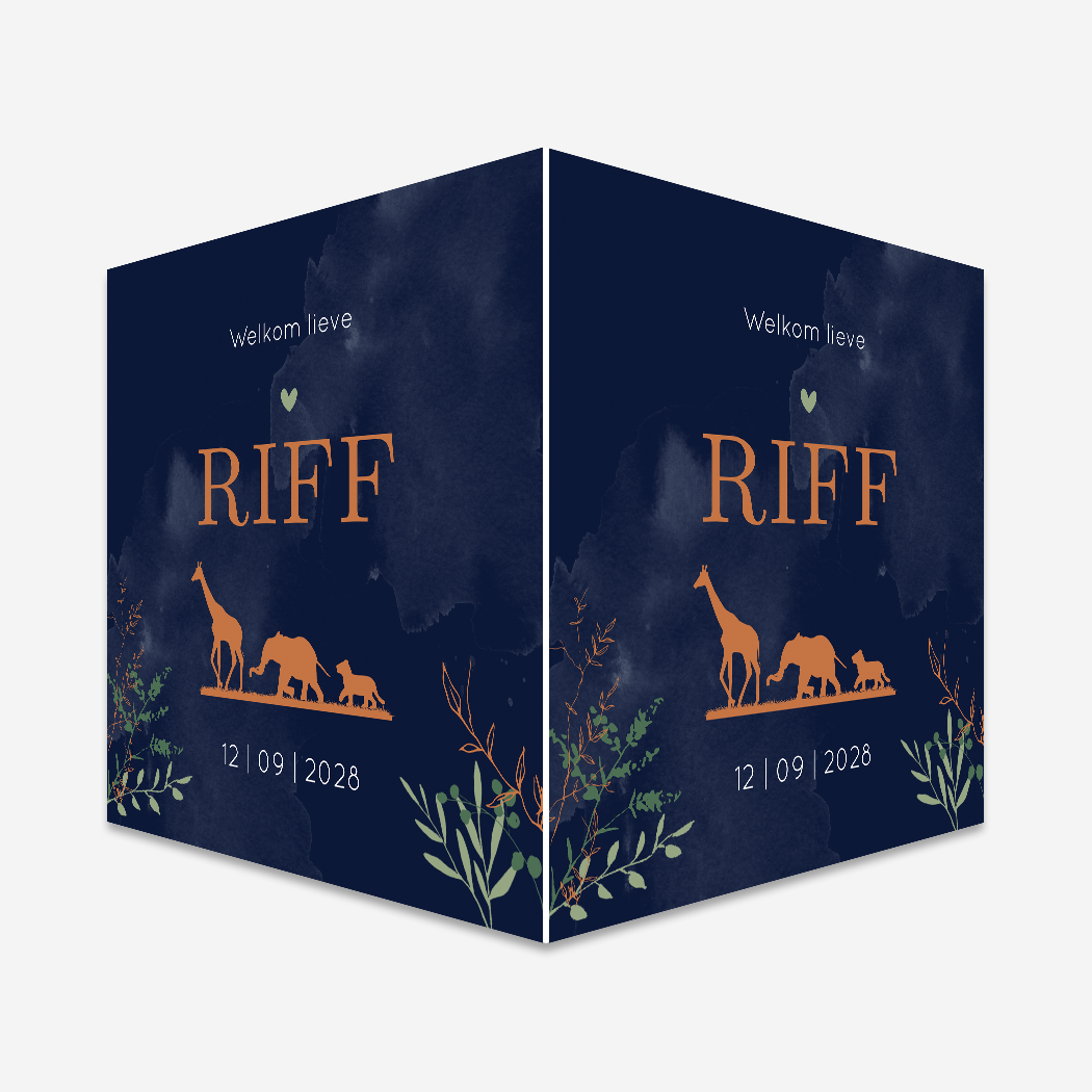 Een illustratief warm donker blauw Savanne raambord met een silhouet tekening van een giraffe, olifantje en leeuwtje. Geboorteraambord heeft witte vlekken wat het een stoer kaartje maakt. De takjes en groene kleuren en bruine tinten voor de dieren zorgen voor een speels effect.