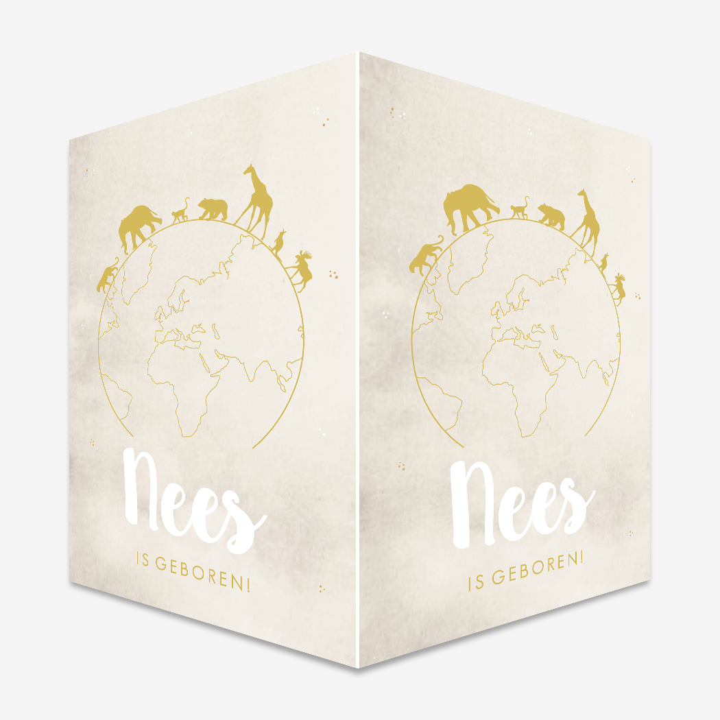 Stoer beige raambord met een wereldbol en dieren. Raambord Nees bevat een giraffe, edelhert, kangoeroe, ijsbeer, aapje, olifant en jaguar. Je kan naar eigen wens dieren vervangen in de editor.