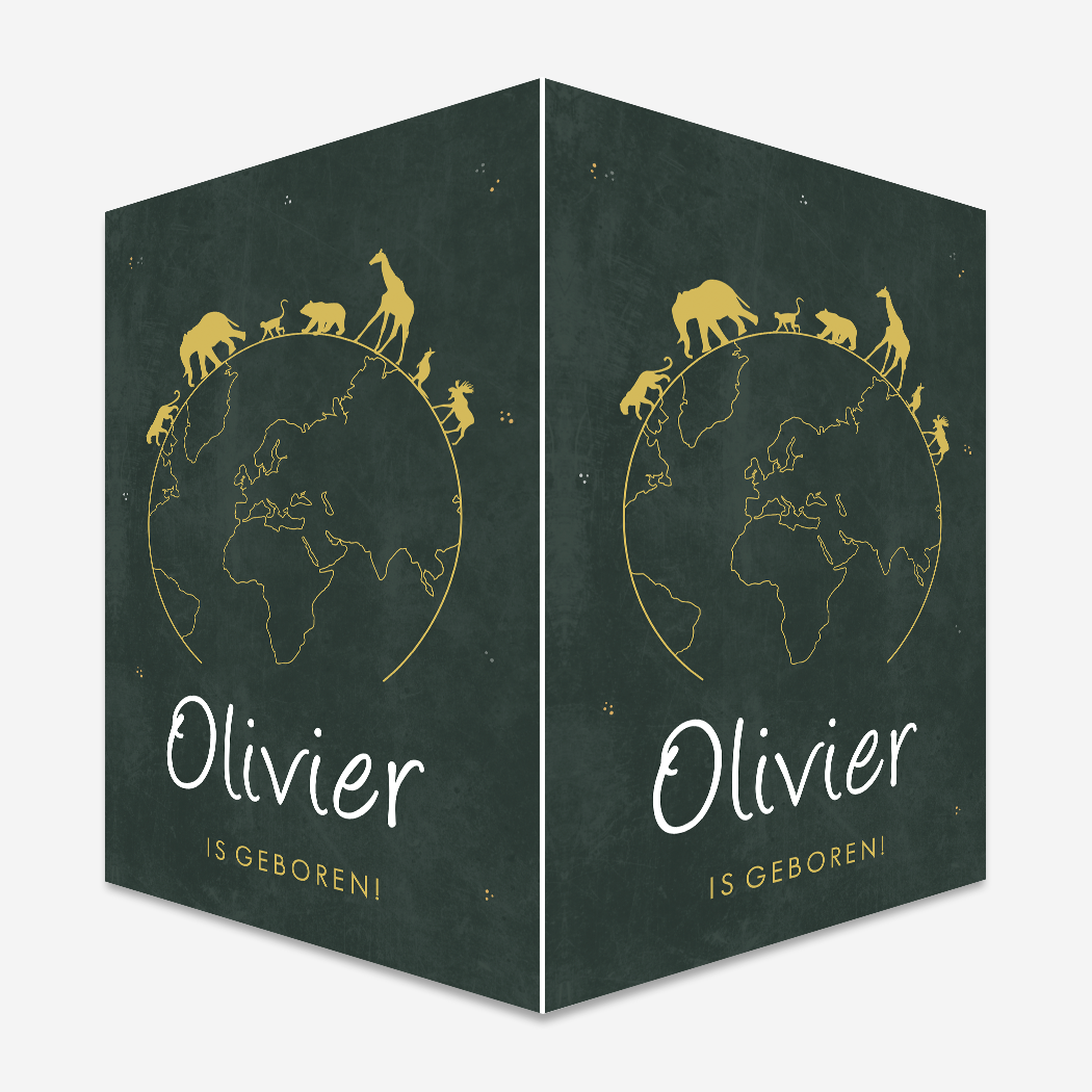 Stoer donkergroen raambord met een wereldbol en dieren. Raambord Olivier bevat een giraffe, edelhert, kangoeroe, ijsbeer, aapje, olifant en jaguar. Je kan naar eigen wens dieren vervangen in de editor.