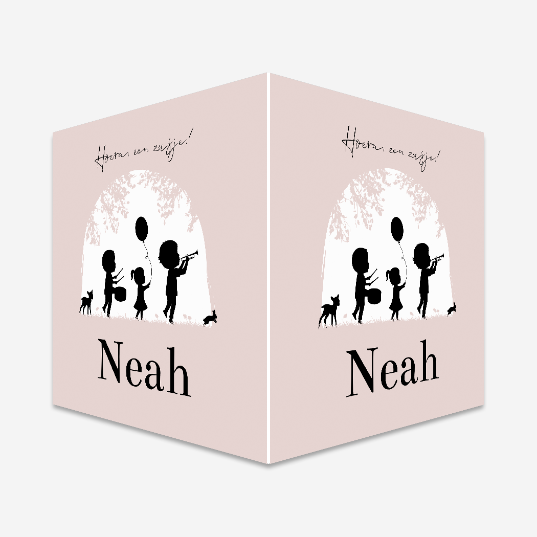 Een feestelijk raambord in roze kleur met de opdruk van kindjes in de vorm van silhouetten. De kindje maken een muziekoptocht omdat het feest is, er is een zusje geboren! Je past raambord Neah eenvoudig en snel aan in onze online editor.