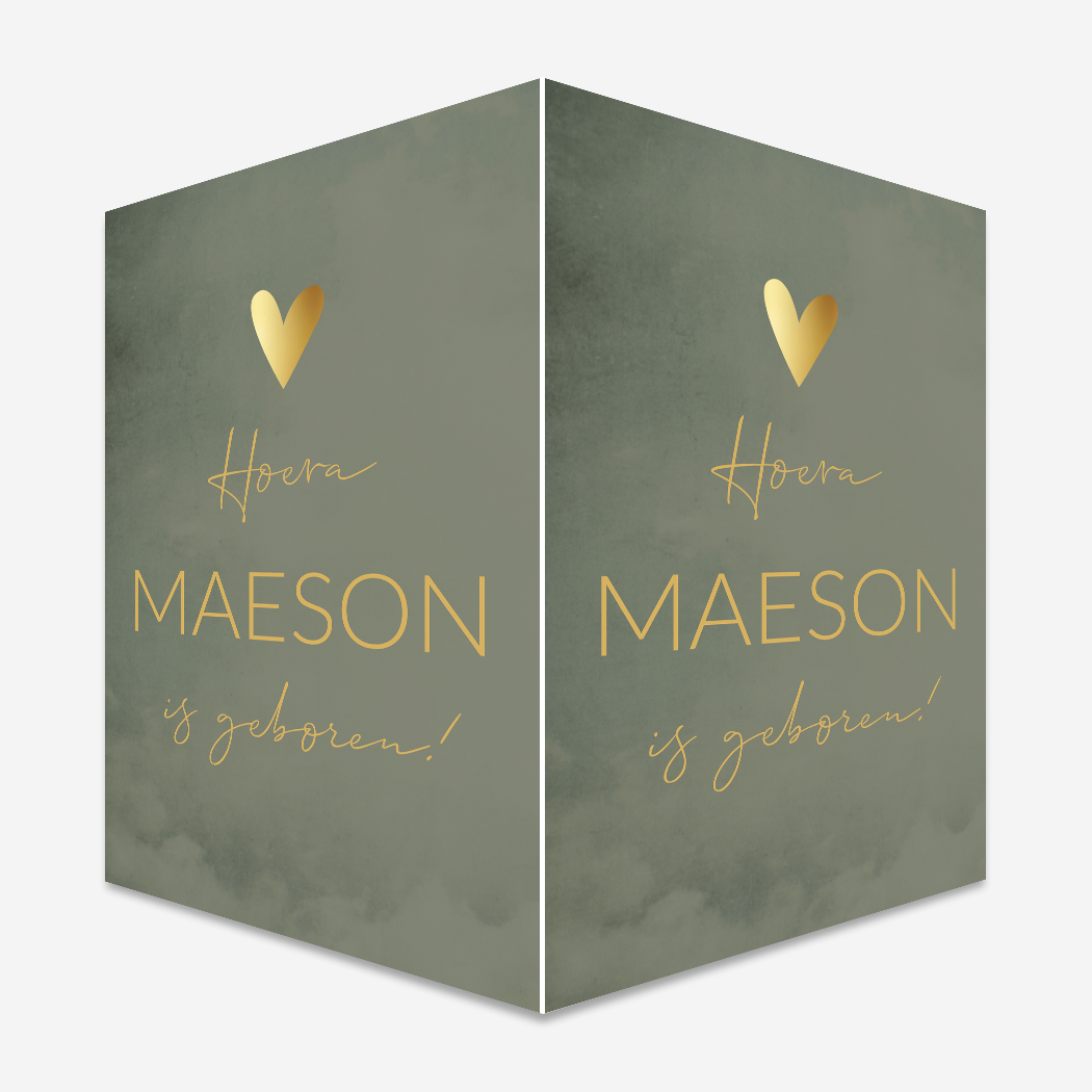 Groen gewolkt raambord Maeson met een goudkleurig hartje, stoere letters voor de naam en sierlijke letters voor de teksten 'Hoera' en 'is geboren'. Pas het raambord eenvoudig naar eigen wens aan in de editor.