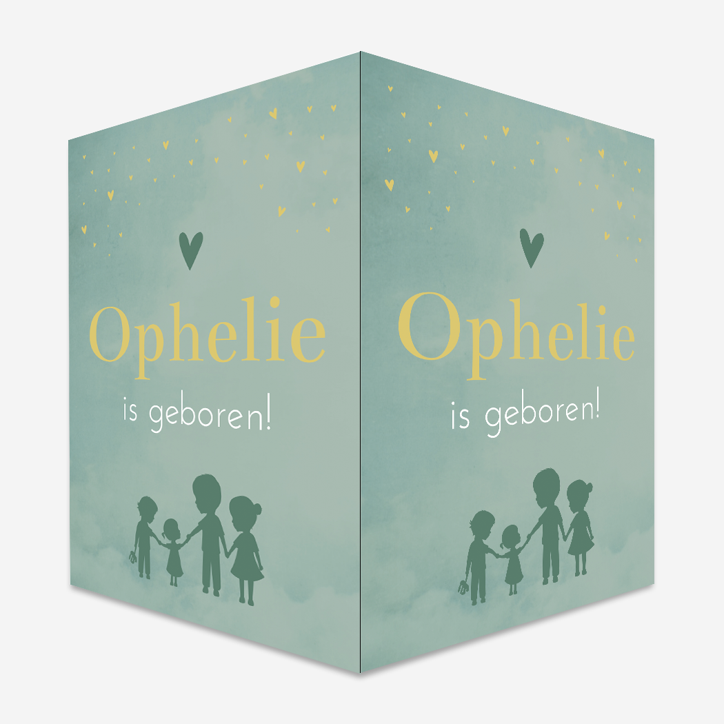 Super mooi raambord in groenige kleur van twee grote broers en een zus die hun kleine zusje aan de hand houden en verwelkomen in het gezin. De kleur van het raambord Ophelie is mint groen/ blauw van kleur en kan aangepast worden naar iedere gewenste kleur. Wil je liever een andere illustratie/ gezinssamenstelling? Dit kun je in de editor vinden. Staat jouw combinatie er niet bij? Stuur ons dan een mailtje, dan maken wij het voor je!