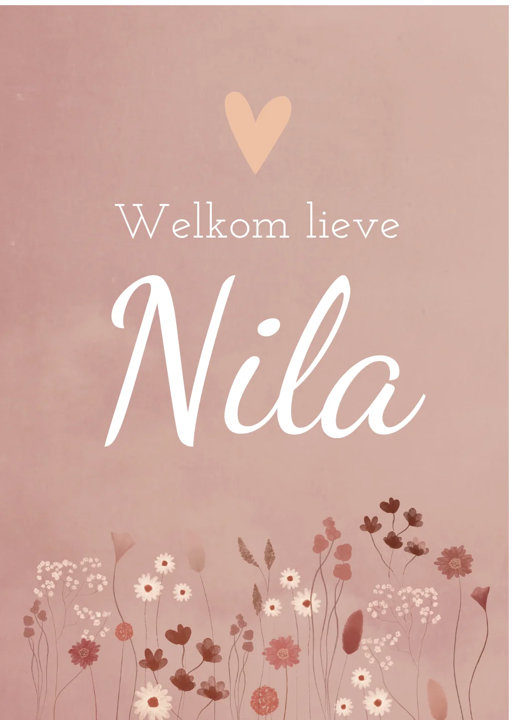Een zacht lief roze raambord met een getekend bloemenveld met droogbloemen. De naam Nila kun je aanpassen. Een romantisch roze raambord om de geboorte van jouw/jullie meisje aan te kondigen. Pas het raambord eenvoudig naar eigen wens aan in de editor.