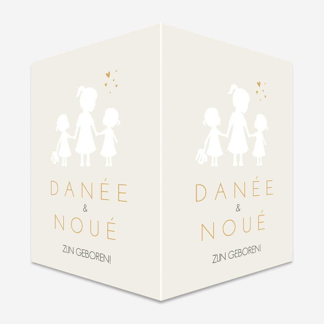 Een strak beige/ crème geboortebord voor op het raam met een silhouet tekening van een zus die haar kleine zusjes aan de hand houdt. Wil je raambord Danée & Noué graag aanpassen? Neem dan een kijkje in onze editor voor alle opties.