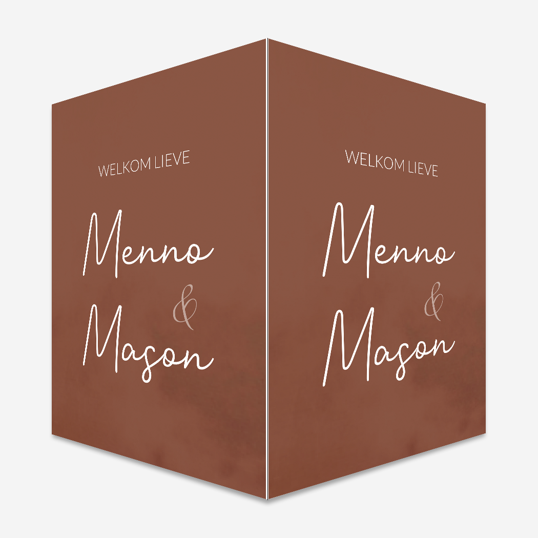 Een gewolkt roest bruin/rood geboortebord voor op het raam met een sierlijk lettertype voor een tweeling. Raambord Menno en Mason is neutraal en simplistisch. Een perfect ontwerp voor een tijdloos kaartje.