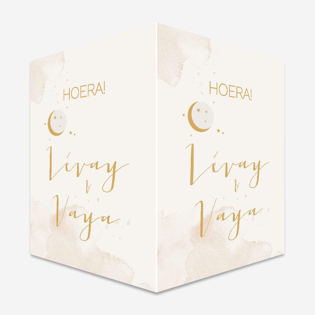 Trendy en hip geboortebord voor op het raam voor een tweeling Lévay & Vaya met een beige aquarel achtergrond met vlekken en de naam in goudkleur. Je past dit ontwerp volledig zelf aan in de editor. Tip: leuk om te geven als kraamcadeau!
