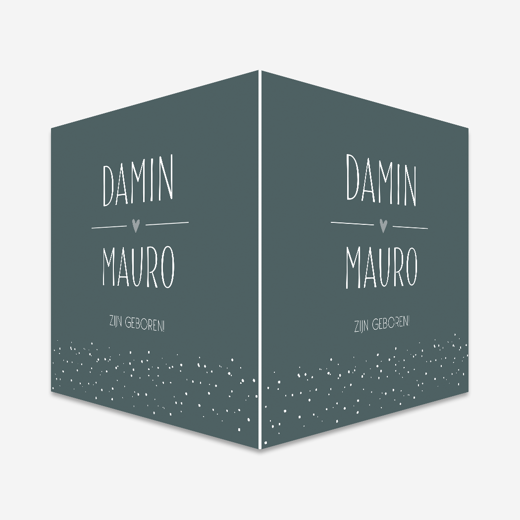 Een stoer donkerblauw geboortebord voor op het raam voor een tweeling, 2 broertjes, met witte letters en stippen. Je past geboortebord Damin en Mauro eenvoudig en snel aan in onze editor. Tip: Leuk om te geven als kraamcadeau!