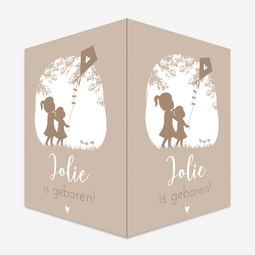 Een ontzettend lief raambord voor ieder nieuw wonder! Geboortebord Jolie is een zacht oud roze/ beige ontwerp met een illustratie van twee zusjes die spelen met een vlieger. Wil je liever een andere illustratie er op hebben staan? Neem dan een kijkje in onze editor voor alle opties. Mis je iets? Neem dan gerust contact met ons op!