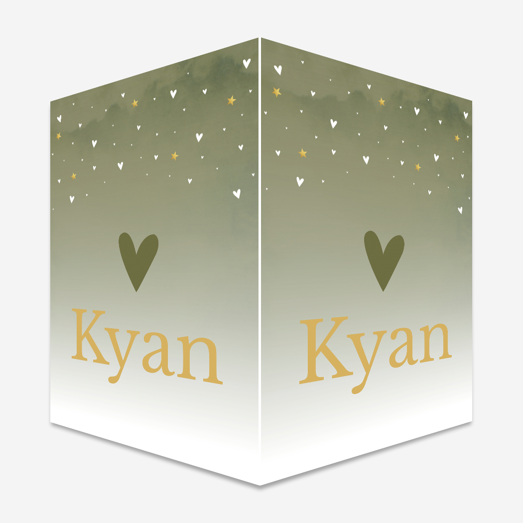 Een sfeervol raambord Kyan met een groen gewolkte achtergrond met witte hartjes en goud kleurige sterretjes. Het grote hart is in legergroene kleur, de naam in goud gele kleur. Je past hem helemaal zelf aan in de editor!