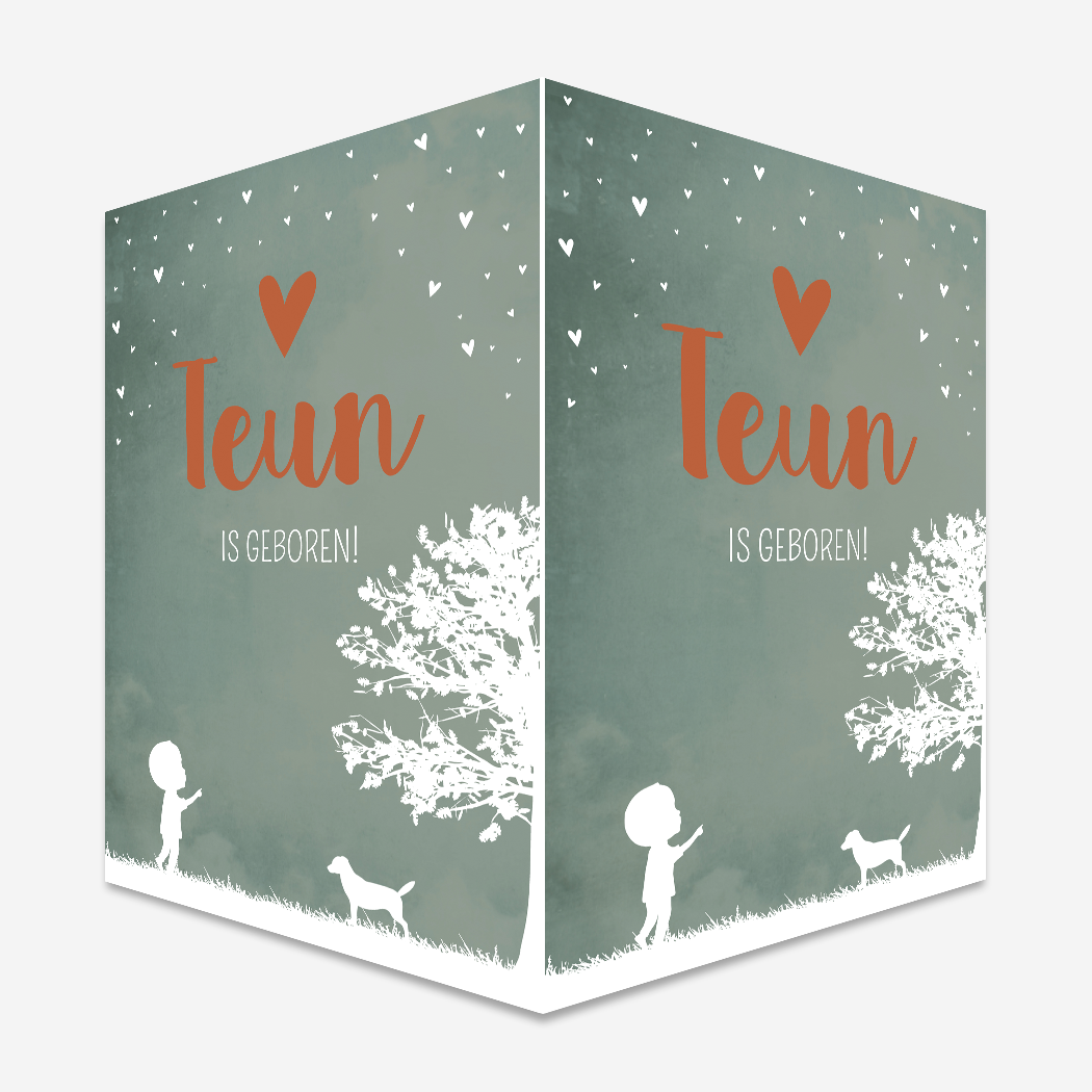 Raambord Teun is een mintgroen raambord met daarop een illustratie van een boom, jongetje en hondje.