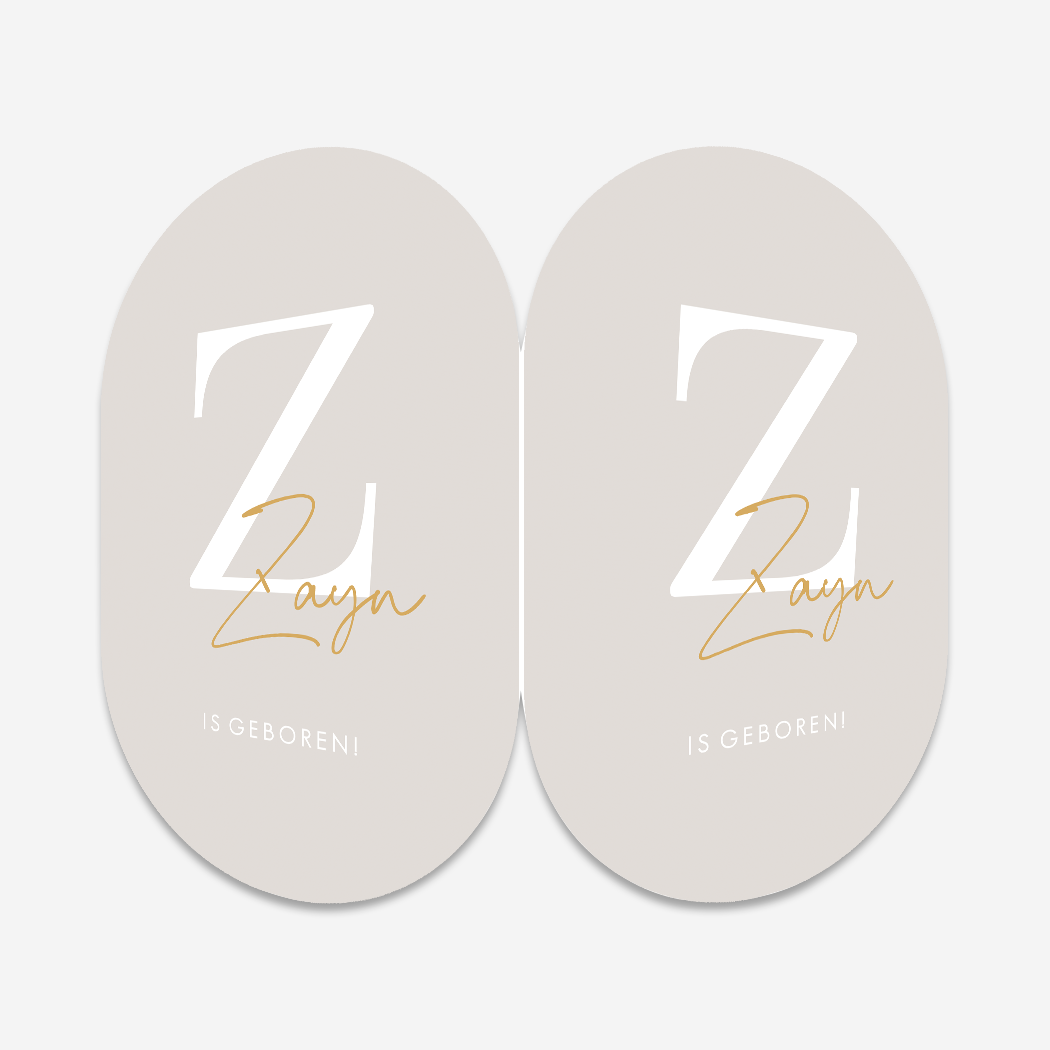 Een beige hip raambord met een witte letter als initiaal. De naam staat in een sierlijke handgeschreven letter in een goudkleur. Raambord Zayn is klassiek en tijdloos maar door zijn ovale vorm toch bijzonder.