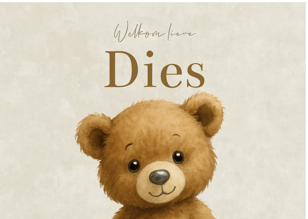 Lief, zacht en neutraal beige/crème geboortebord voor op het raam met een teddybeertje en een velvet look achtergrond. Op raambord Dies kun je de illustratie aanpassen naar jouw wensen. In de beeldbank vind je veel mooie tekeningen waar je uit kunt kiezen.