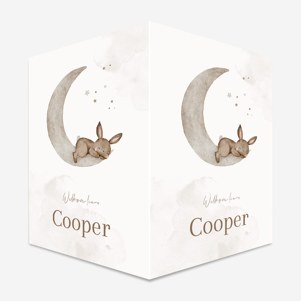 Love you to the moon and back! Een neutraal beige raambord met een waterverf illustratie van een schattig slapend konijntje op de maan. Het konijntje wordt omringd door kleine sterretjes en op de achtergrond zie je waterverfvlekken. Pas raambord Cooper gemakkelijk zelf aan in onze editor!