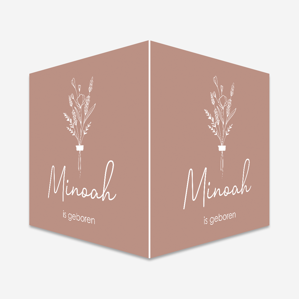 Een oudroze raambord met een lijntekening van bos bloemen. Wil je raambord Minoah graag aanpassen in bijvoorbeeld de kleur van de babykamer of met een geboortebloem? Geen probleem, je past de kleur en opmaak eenvoudig aan in de editor.