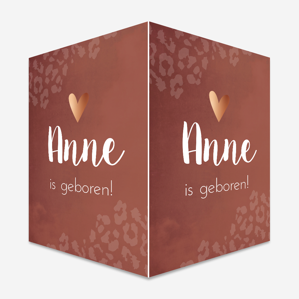 Een stoer raambord met een prachtig warme roestbruine tint. In de hoeken is op raambord Anne een panterprint patroon geplaatst en om het kaartje wat romantischer te maken staat er een groot koperkleurig hartje op het bord.