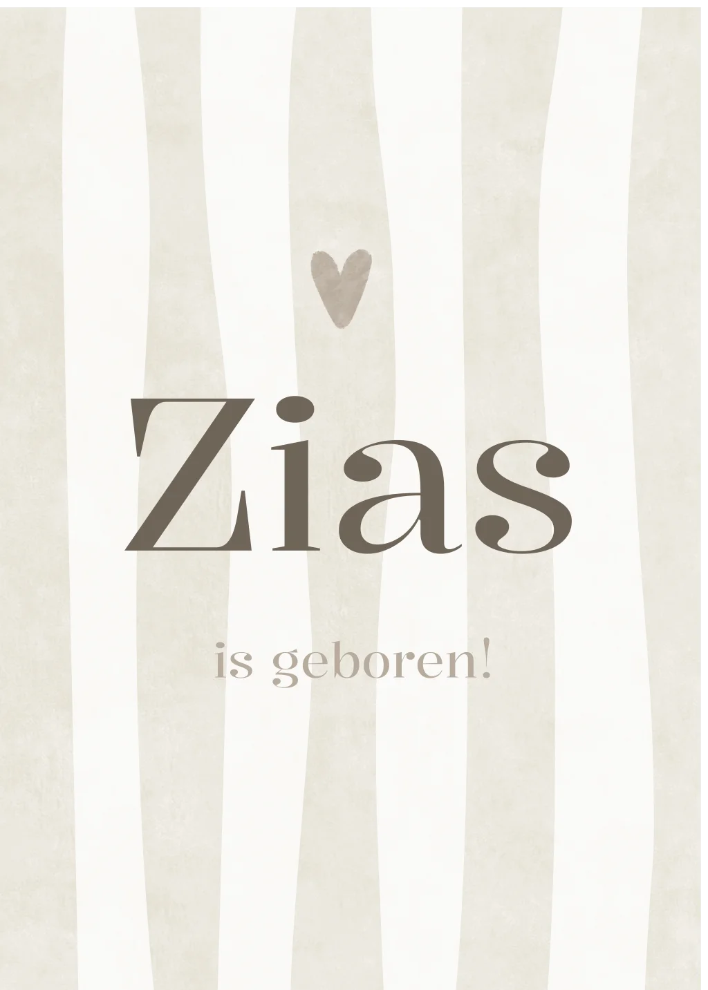 Dit gestreepte geboortebord voor op het raam Zias heeft een rechthoekige vorm. De zacht beige kleur met strepen in licht crème kleur en bruine letters en hartje, maakt het tuinbord heel tijdloos en gender neutraal. De kleur pas je gemakkelijk aan in onze editor.