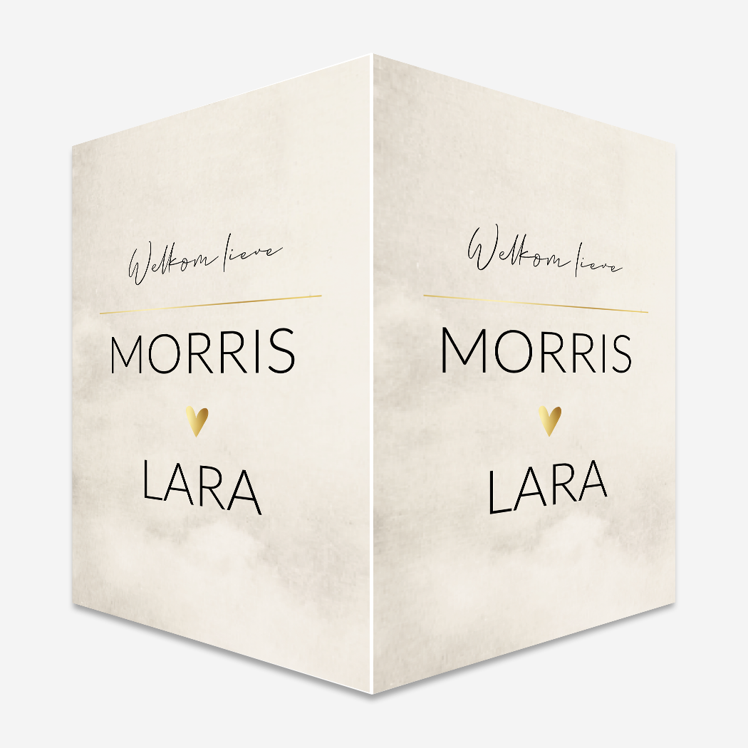 Een beige crème gewolkt raambord voor een tweeling. Raambord Morris en Lara is een prachtig neutraal geboortekaartje met een goudlook hartje.