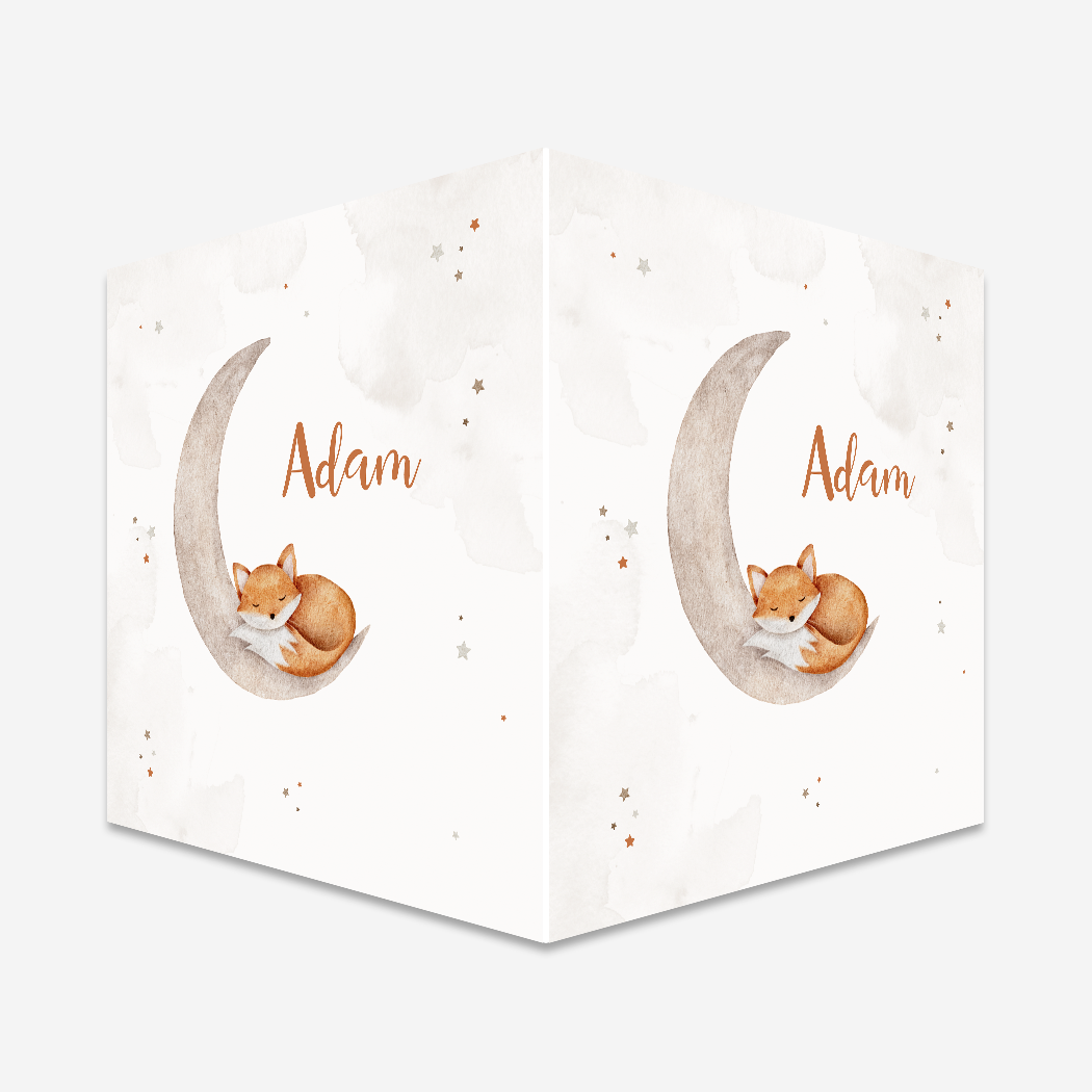 Love you to the moon and back! Een neutraal beige geboorteraambord met een waterverf illustratie van een schattig slapend vosje op de maan. Het vosje wordt omringd op raambord Adam door kleine sterretjes in watercolor en koperfolie en op de achtergrond zie je waterverfvlekken.