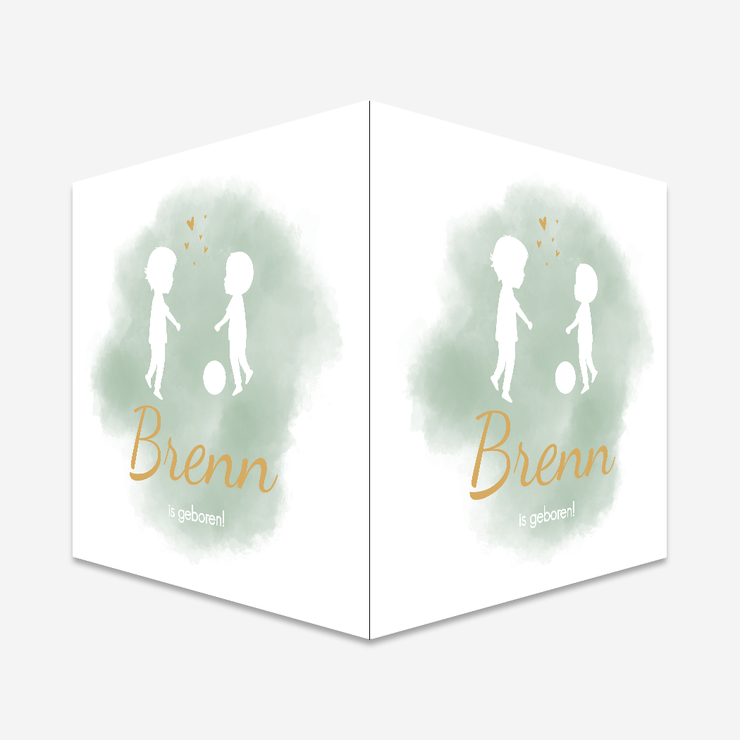 Een stoer rond geboortebord voor op het raam in groene kleur. Twee broertjes zijn aan het voetballen. Je past de silhouet van raambord Brenn helemaal aan naar jouw gezinssituatie.