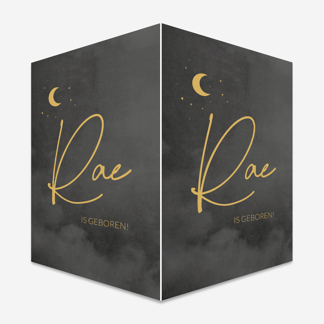 Een stoer zwart gewolkt raambord. Op raambord Rae staat de naam groot in een sierlijk lettertype en wordt aangevuld door een maantje en hartjes/sterretjes. Wil je dit raambord graag aanpassen?