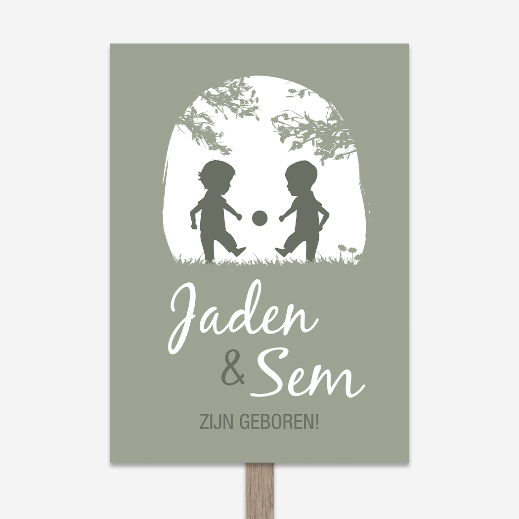 Een bord voor in de tuin voor een tweeling met een sprookjesachtig doorkijkje in groene tinten. Toch liever een andere kleur? Tuinbord Jaden & Sem is gemakkelijk aan te passen in de editor. Tip: leuk om te geven als kraamcadeau!