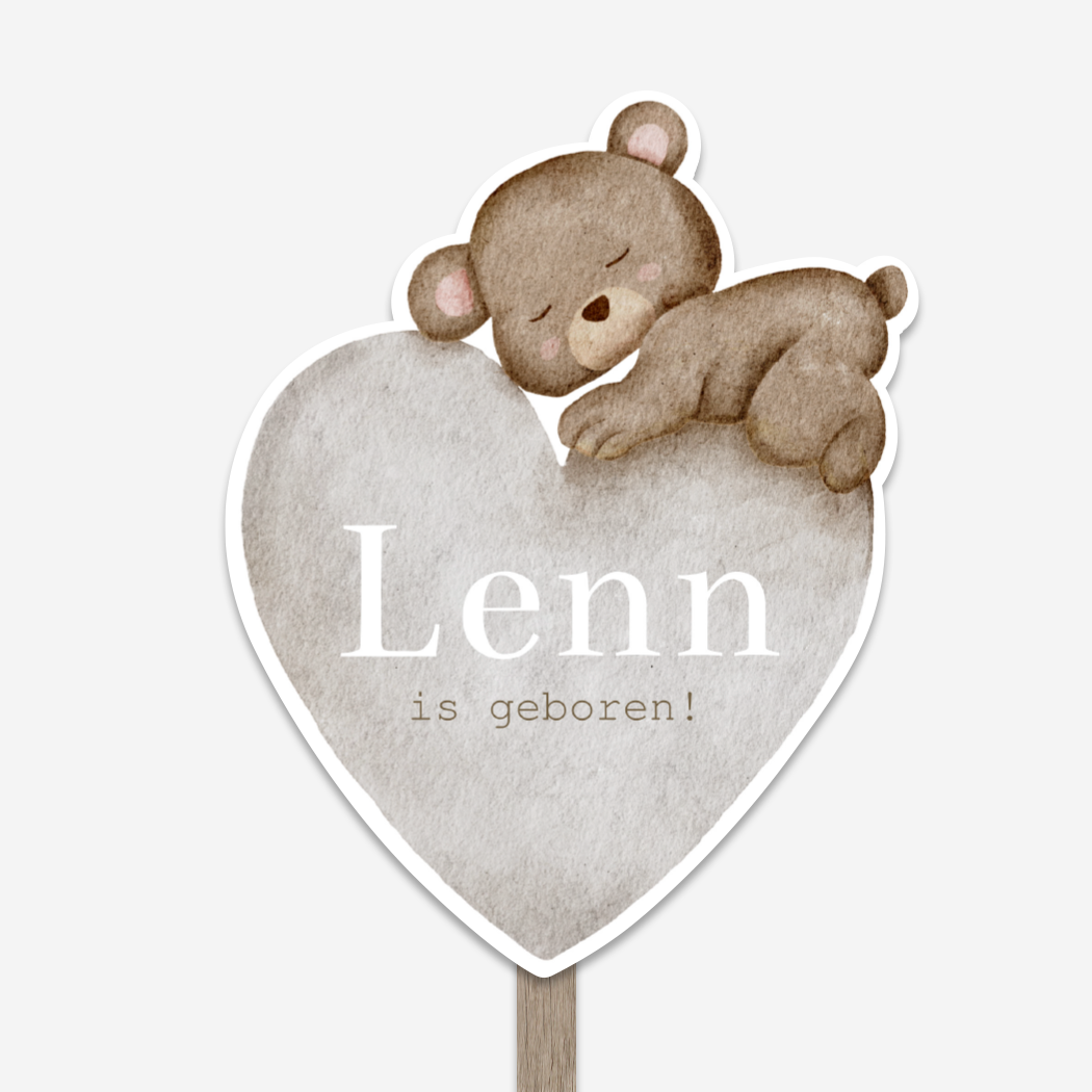 Met dit unieke tuinbord in de vorm van een slapend beertje op een hartje, kun je op een bijzondere manier de geboorte van je kindje aankondigen. Het geboortebord Lenn is gemakkelijk aan te passen in de editor.