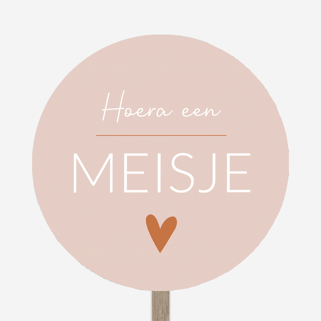 Strak en modern tuinbord Jasmina 'Hoera een meisje' in roze kleur met witte letters en een roest bruin / koper kleurig hartje. Je past hem naar eigen wens aan in de editor.