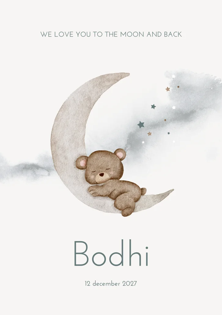 Love you to the moon and back! Een neutraal beige en blauw geboortekaartje met een waterverf illustratie van een schattig slapend beertje op de maan. Het beertje wordt omringd door kleine sterretjes en op de achtergrond zie je waterverfvlekken. Kaartje Bodhi is prachtig door de kleine koperfolie sterretjes. Wil je graag iets aanpassen, neem dan een kijkje in onze editor voor de vele opties!
