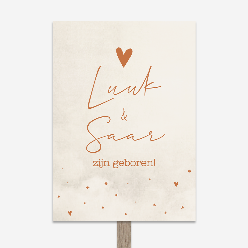 Trendy beige gewolkt bord voor in de tuin met roestbruine opdruk van de namen Luuk en Saar. Dit tuinbord is voor een tweeling. Je past het geboortebord eenvoudig en snel aan in onze online editor. Tip: leuk om te geven als kraamcadeau!