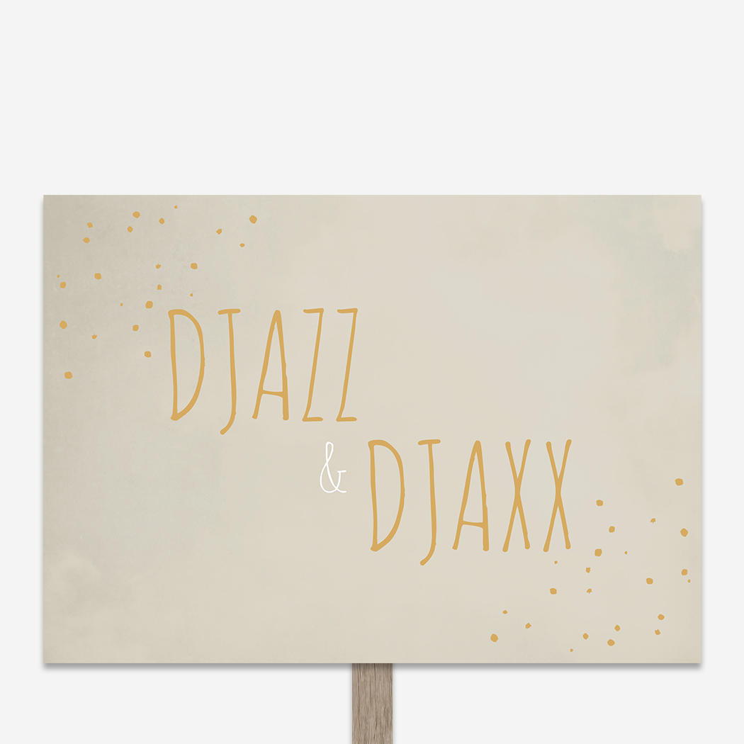 Een stoer en eenvoudig geboortebord voor in de tuin met een beige/ taupe gewolkte achtergrond en goudkleur voor de stipjes en de namen. Tuinbord Djazz en Djaxx is een eenvoudig maar toch stoer ontwerp. Je past het geboorte tuinbord eenvoudig en snel aan in onze online editor. Tip: leuk om te geven als kraamcadeau!