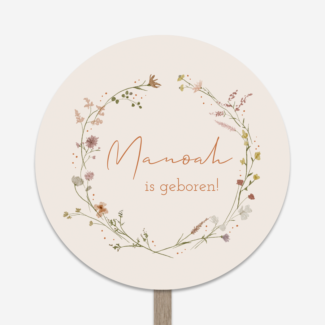 Een lief en romantisch rond geboortebord voor in de tuin met een watercolor krans. Op tuinbord Manoah staat de naam en een paar stipjes rondom de krans in een bruine kleur. Wil je graag iets aanpassen? Neem dan een kijkje in onze editor voor de vele opties!