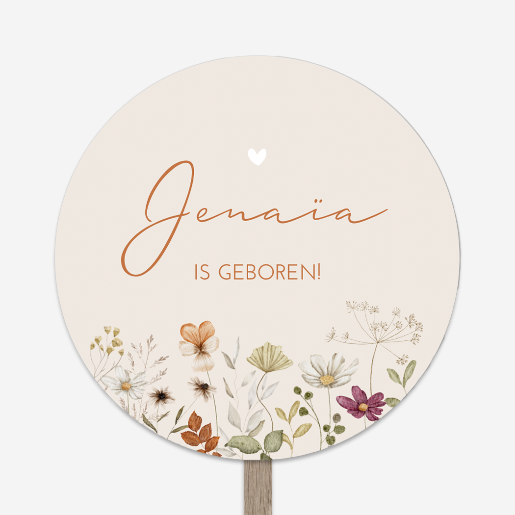 Een lief en romantisch rond geboortebord voor in de tuin met allerlei waterverf bloemetjes in diverse kleuren. Op tuinbord Jenaïa staat de naam in een chique bruine kleur. Wil je graag iets aanpassen? Neem dan een kijkje in onze editor voor de vele opties!