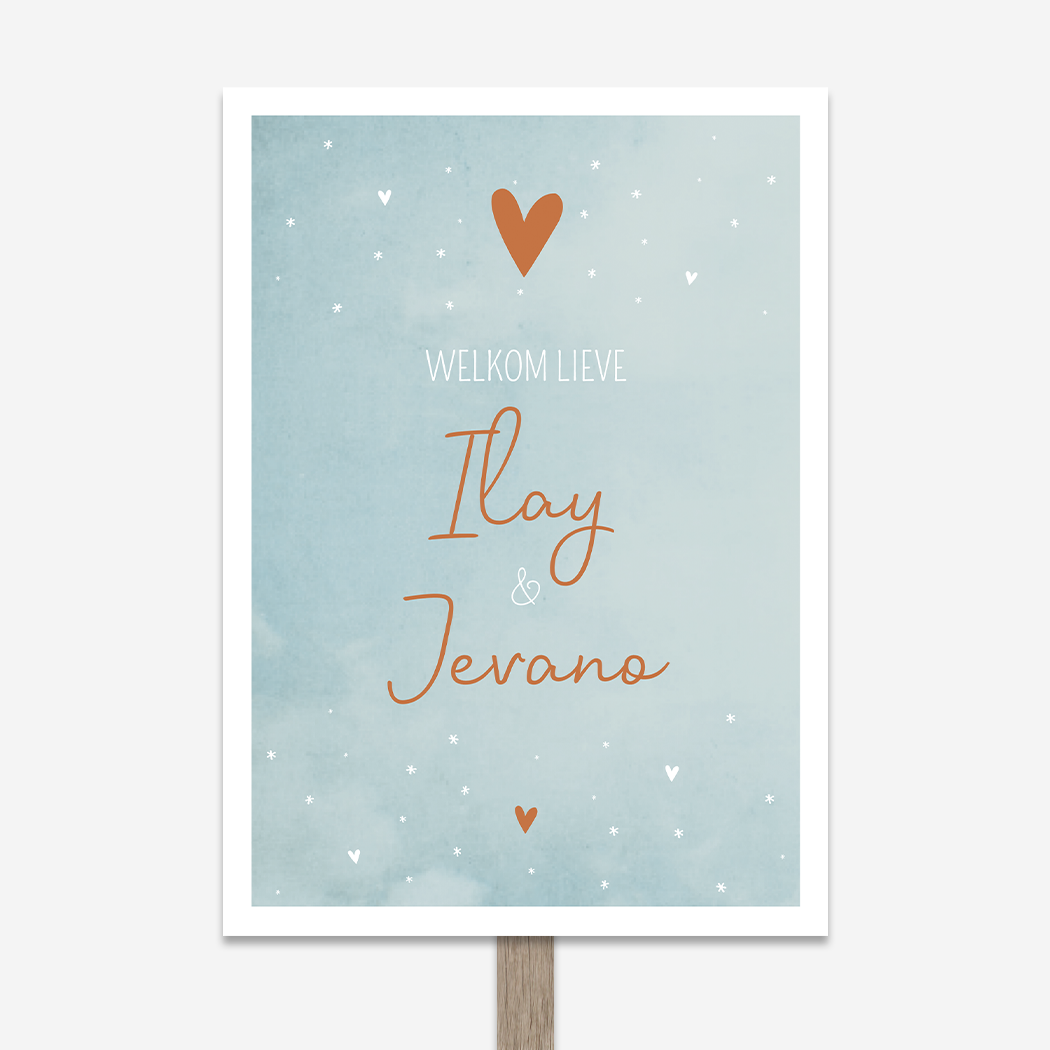 Een stoer en lief geboortebord voor in de tuin. Tuinbord Ilay en Jevano heeft een lichtblauwe achtergrond wat zowel dromerig als stoer is. Door de koperkleurige letters springen de namen eruit!