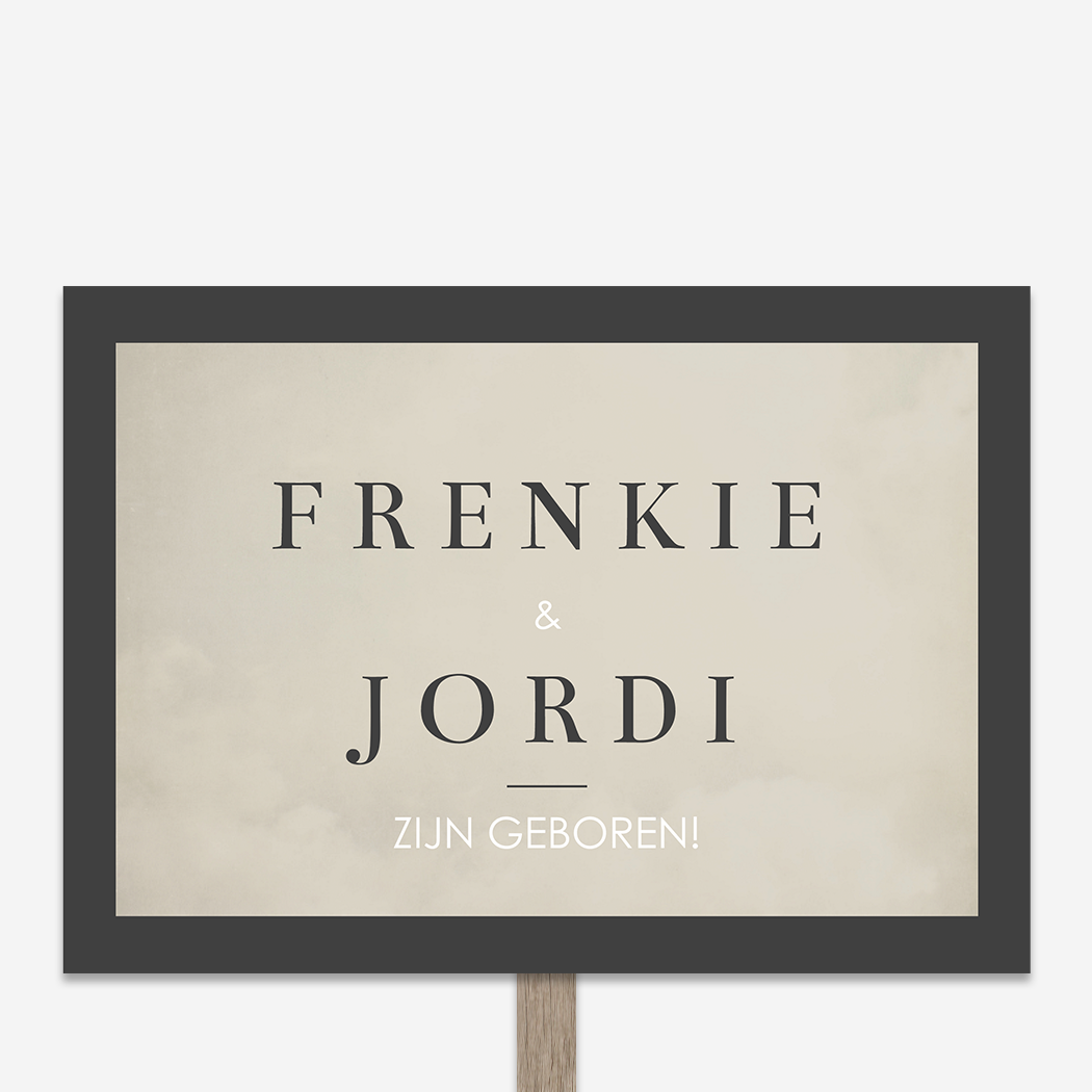 Een bijzondere combinatie bij ontwerp Frenkie en Jordi, het tuinbord heeft namelijk een klassieke maar ook stoere uitstraling. Door de antracietkleurige omranding krijgt het bord een stoere touch. Door de combinatie met het klassieke lettertype voor de namen wordt het geheel wat chiquer. Je past het geboorte tuinbord eenvoudig en snel aan in onze online editor. Tip: leuk om te geven als kraamcadeau!