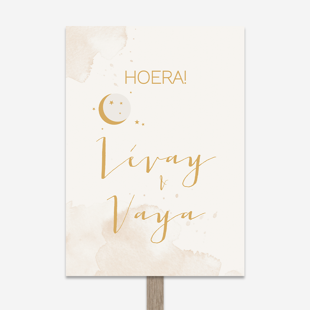 Trendy en hip geboortebord voor in de tuin voor een tweeling Lévay & Vaya met een beige aquarel achtergrond met vlekken en de naam in goudkleur. Je past dit ontwerp volledig zelf aan in de editor. Tip: leuk om te geven als kraamcadeau!