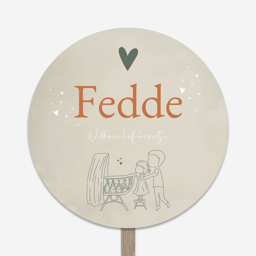 Een illustratief warm geboortebord Fedde voor in de tuin in groen tinten met witte hartjes en een groene kleur voor de lijntekening van het wiegje en het kindje wat op een krukje over het randje van de wieg kijkt. Je kunt kaartje Fedde volledig zelf aanpassen zoals je wilt, maak er wat moois van! Er wordt géén paal bij het bord geleverd. De gaten voor de schroeven in het bord, dienen te worden voorgeboord. Zet de schroeven niet klem op het bord i.v.m. teveel spanning. Gebruik 1 of 2 palen met een platte kant, géén ronde palen! Zet de palen volledig achter het bord over de hele breedte/hoogte. Zorg dat je voldoende schroeven gebruikt om het bord vast te zetten en verdeel de schroeven over de hele breedte/lengte van het tuinbord. Bij slecht weer adviseren we om het tuinbord naar binnen te halen om schade te voorkomen.