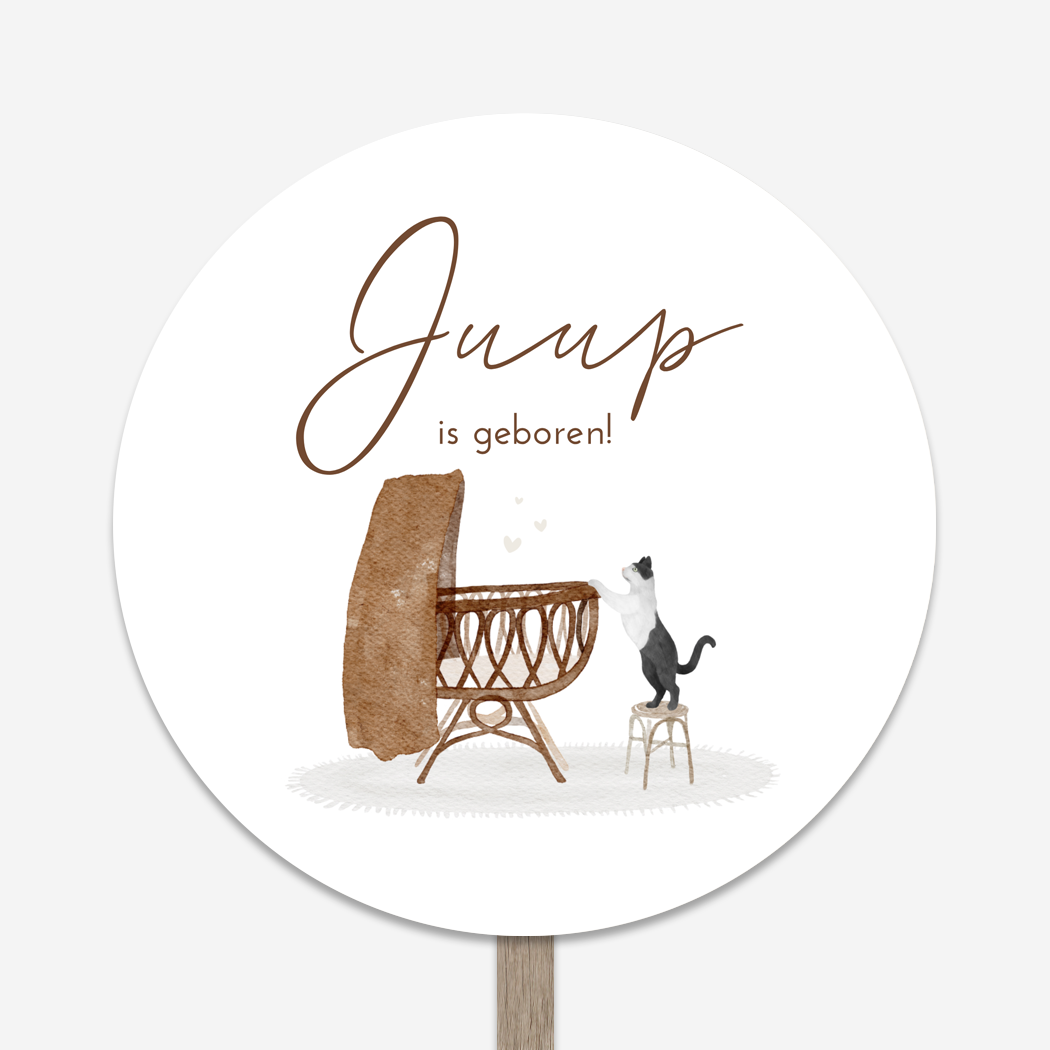 Een schattig geboortebord in ronde vorm Juup, geïllustreerd in watercolor stijl. Op het tuinbord staat een poes die op een krukje staat en in het wiegje kijkt. Ziet jouw kat er anders uit? In onze beeldbank vind je diverse katten. Staat jouw dierenvriendje er niet tussen? Informeer naar de mogelijkheden voor een illustratie op maat!