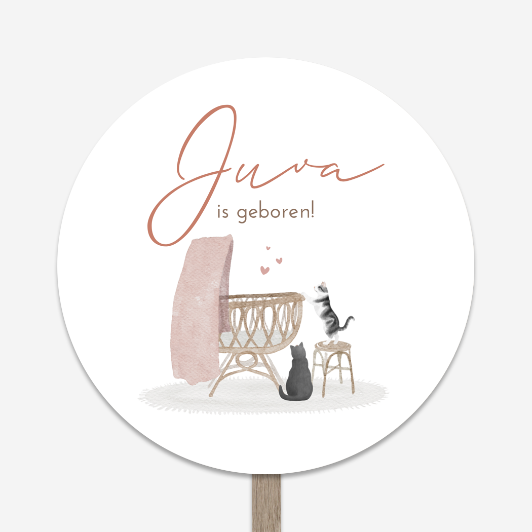 Een schattig geboortebord Juva voor in de tuin, geïllustreerd in watercolor stijl. Op het tuinbord is een poes die op een krukje staat en in het wiegje kijkt. En er zit een katje naast de wieg te kijken. Ziet jouw kat er anders uit? In onze beeldbank vind je diverse katten. Staat jouw dierenvriendje er niet tussen? Informeer naar de mogelijkheden voor een illustratie op maat!