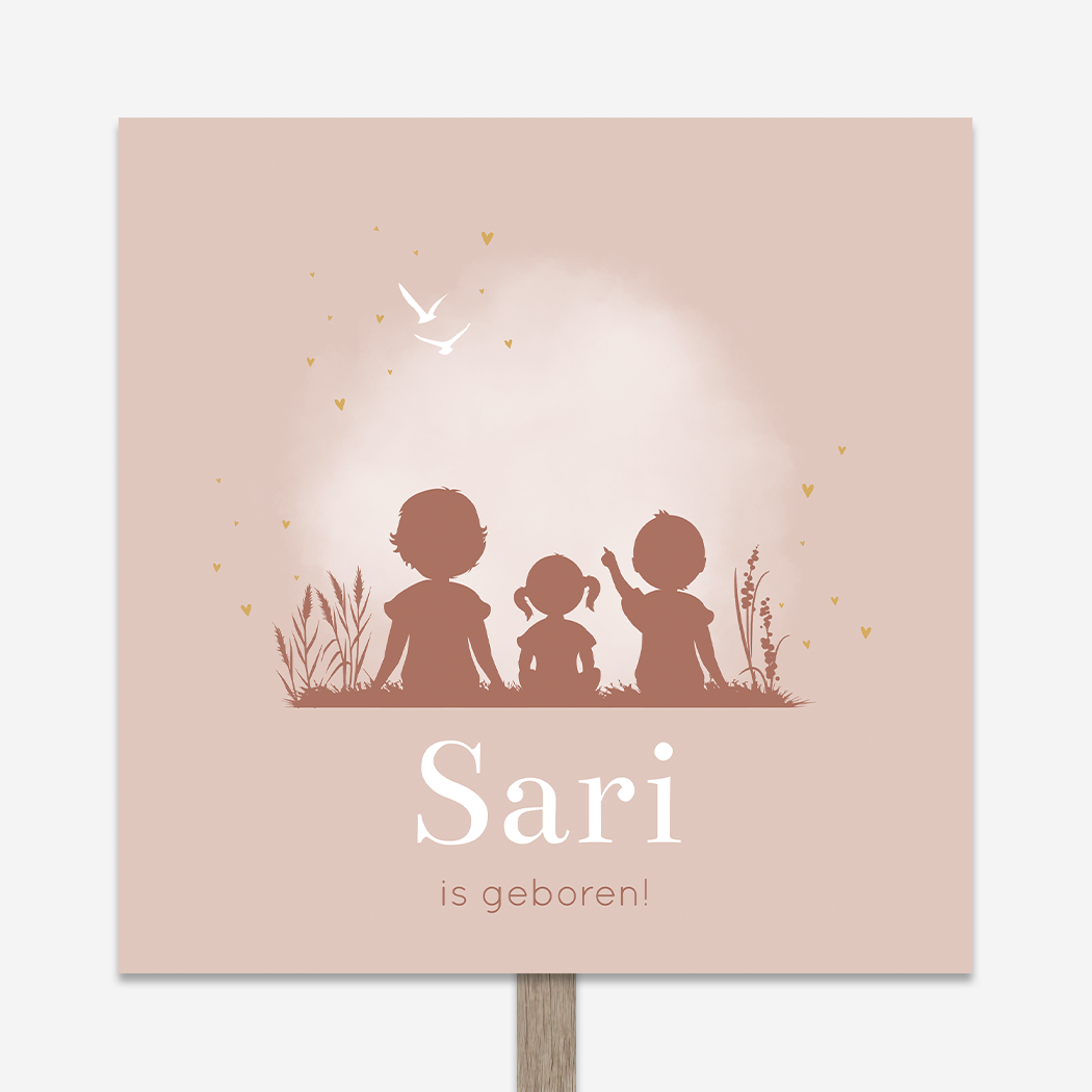 Een roze bord voor in de tuin Sari met een silhouet illustratie van twee broers die met hun kleine zusje in het gras zitten. Ze kijken en wijzen samen naar de vliegende vogeltjes. Ze worden omringd door hartjes.
