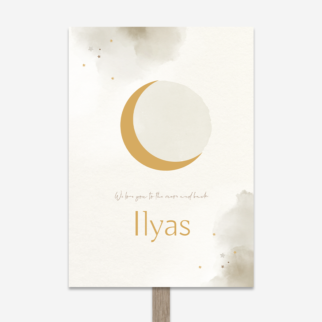 Een beige/crème/ bruin geboortebord voor in de tuin met daarop een illustratie van een man met een maantje er op in oker gele kleur. Daarbij zie je waterverf wolkjes en kleine sterretjes in gele kleur. Je past het ontwerp Ilyas eenvoudig zelf aan.