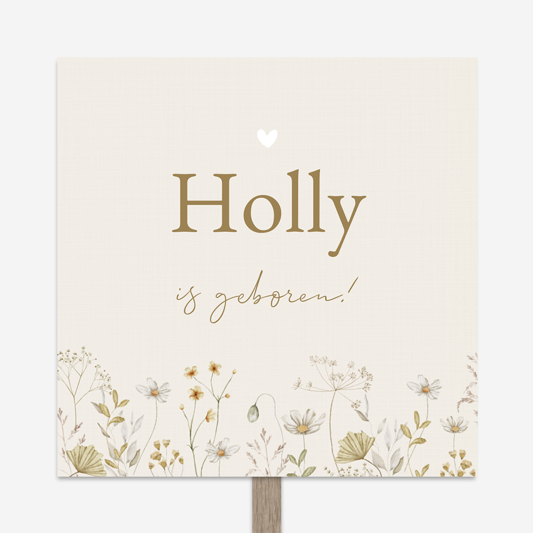 Een romantisch tuinbord met een waterverf/aquarel illustratie van verschillende veldbloemen. Op de achtergrond zit een heel licht linnen effect. Tuinbord Holly heeft een rustige uitstraling door het gebruik van één kleurenfamilie en wordt door het gebruik van klassieke lettertypes een tijdloos ontwerp. Wil je graag iets aanpassen? Neem dan een kijkje in de editor voor de vele opties!